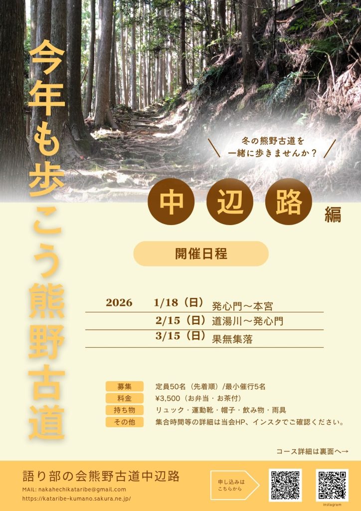 | 4 | 終了 | 2025 2/22(土) | 道の駅~道湯川橋バス停 (集合9:00 道の駅熊野古道中辺路) >>詳細 |