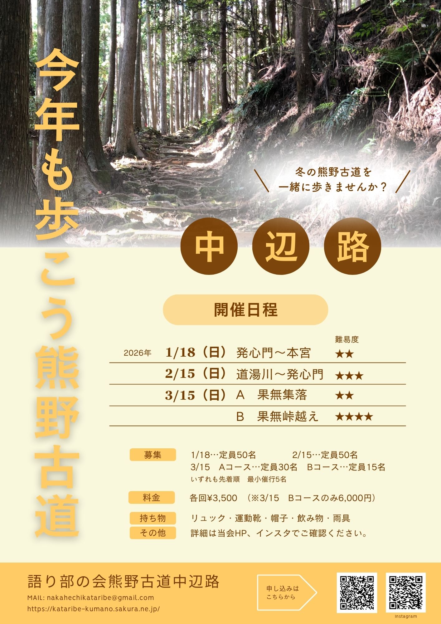 | 第2回 | 募集中! | 2026/2/15(日) | 道湯川~発心門 >>詳細未定 |